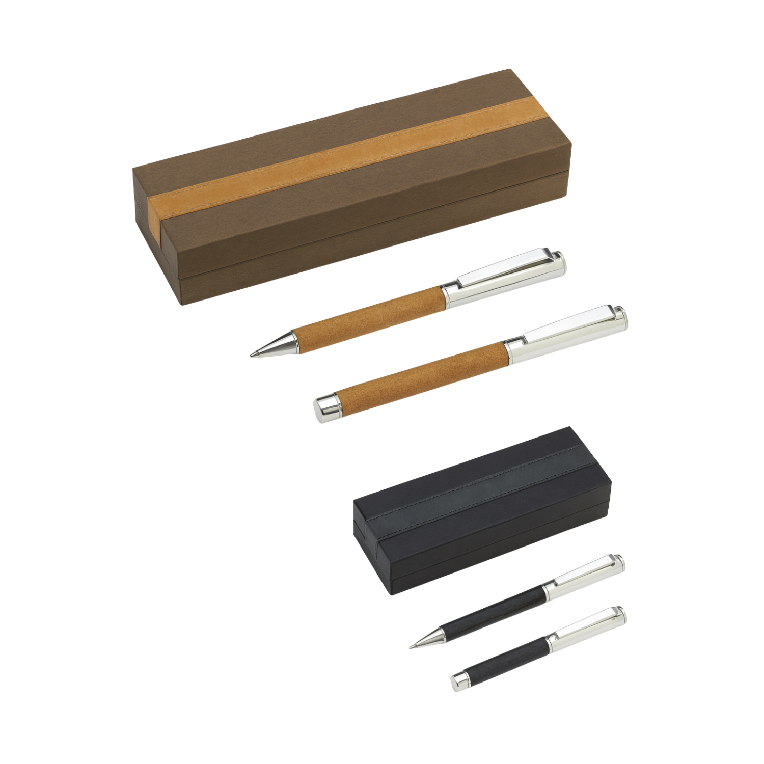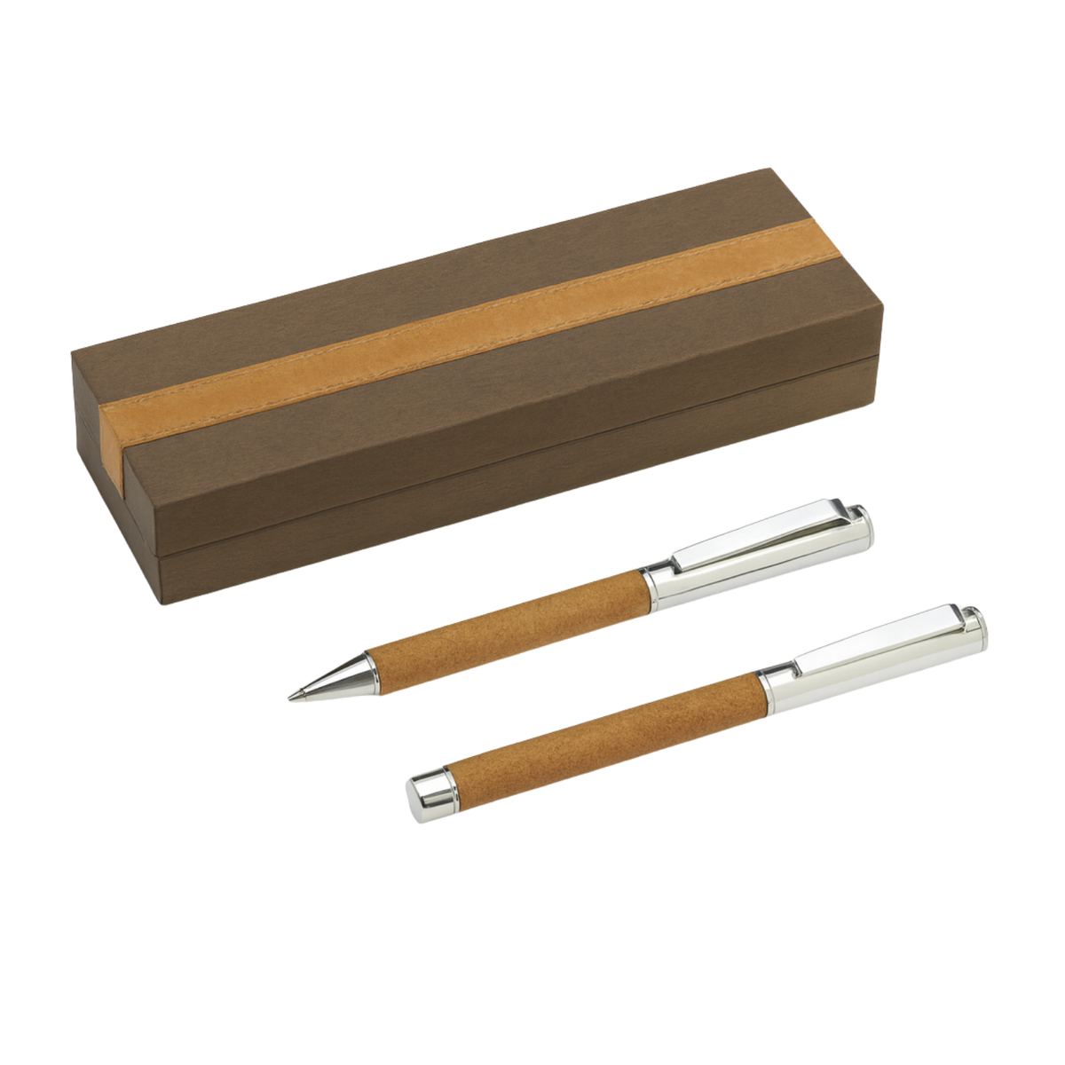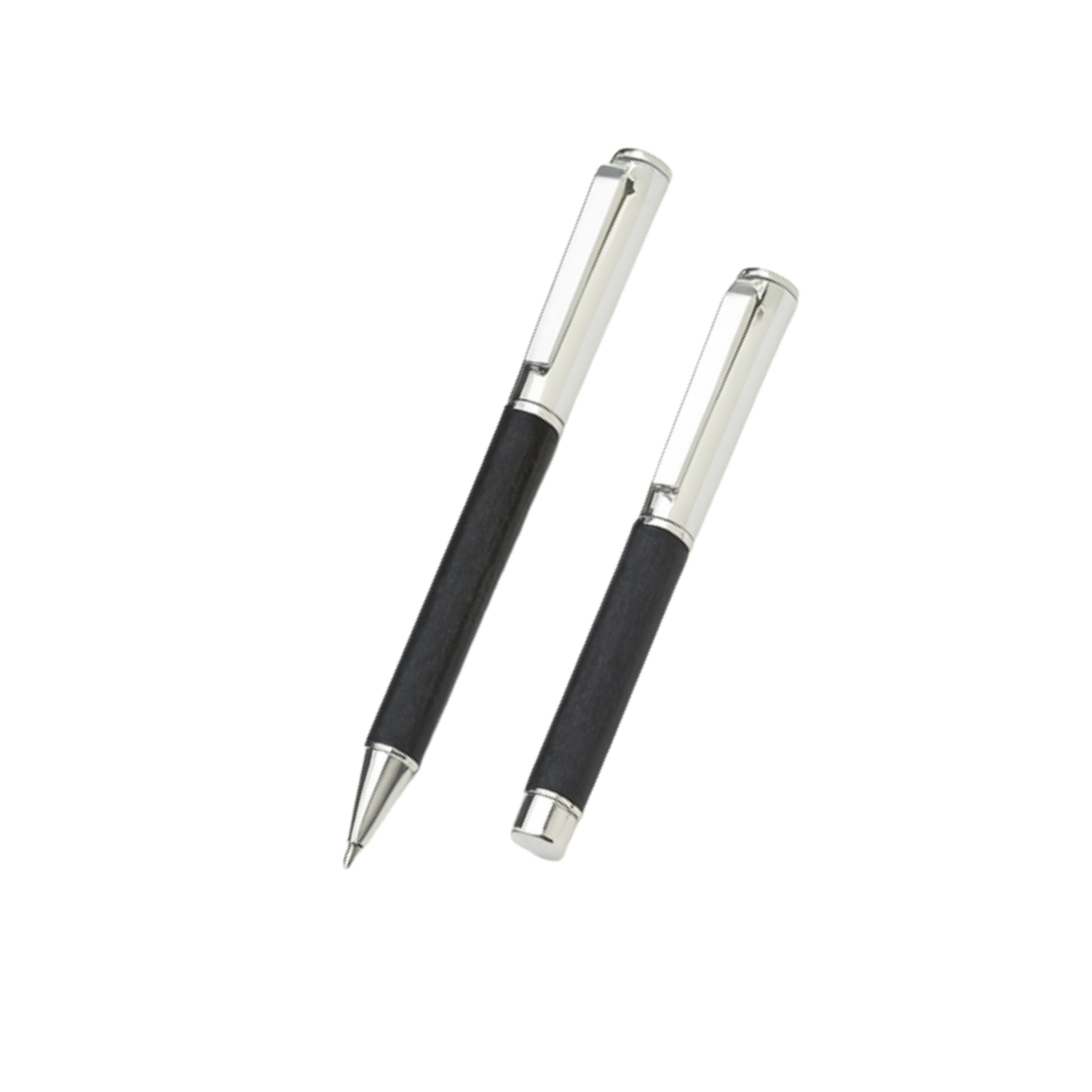 An elegant fusion of luxury and sustainability, this premium pen set includes a metal ballpen and roller pen, both wrapped in recycled leather (R-Leather) for a sophisticated finish.